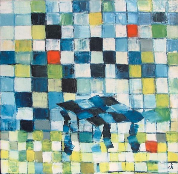klkpl,01, kleinkariert oder Verrückter Tisch, Öl auf Leinwand, 60 x 60 cm. Am selben Tisch sitzend, hörte ich zwei Malern zu, die sich über ein Wochenendseminar bei einem großartigen Meister unterhielten. Das Seminar wäre so gut, dass jeder Teilnehmer von dem einzigen Wochenende mit 20 Bildern nachhause käme. Weil ich den Gedankengang mit der Stückanzahl witzig fand, dachte ich, ich male auf jedes Kästchen der ersten Schicht ein kleines Bildchen und erzähle dann herum, ich hätte in vier 34 Tagen Bilder gemalt.