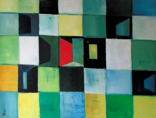 klkpl,02, Großkariert, Öl auf Leinwand, 60 x 80 cm. Ich gehe noch einmal zu meiner Idee zurück, möglichst viele Bilder auf ein Bild zu bringen. Es würde leichter sein, mein Vorhaben durchzuhalten, wenn ich die einzelnen Quadrate größer ansetze. Wieder erwies es sich als überflüssig, den einzelnen Farbflächen noch mehr hinzuzufügen.