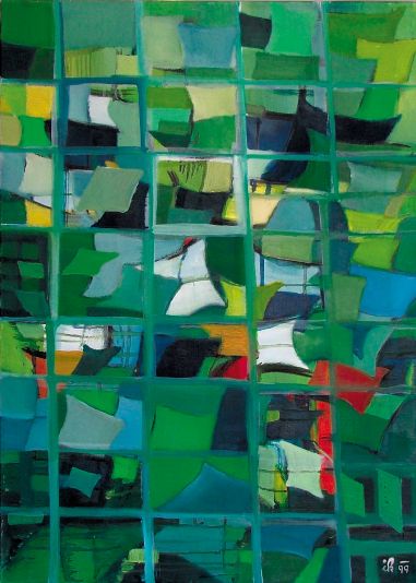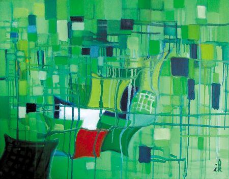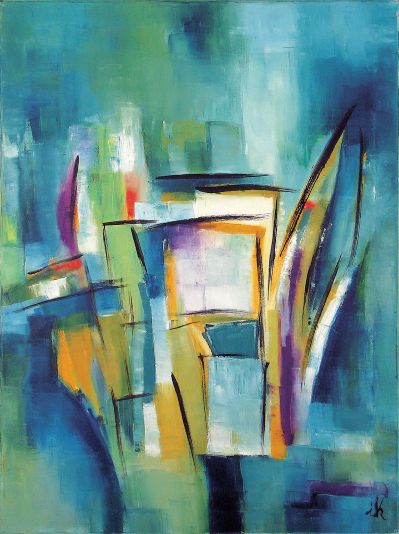 klkpl,16, Blätterformation in Türkis, Öl auf Leinwand, 60 x 80 cm, Juni 2002. Seit ich erfahren habe, dass es kein Leben ohne Existenzangst gibt und seit ich gelernt habe, dass ich meine Ängste durch meine Arbeit, die das Malen ist und was dazugehört, überwinden kann, leiste ich mir manchmal einen verspielten Nachmittag.