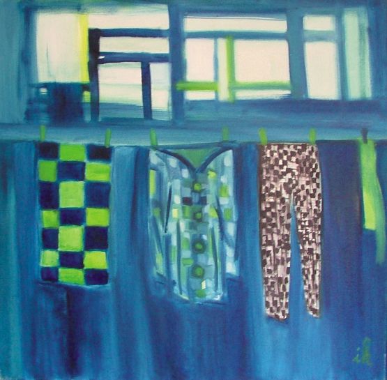 klkpl,05, Stillleben mit Pepitahose, Öl auf Leinwand, 50 x 50 cm. Ich könnte jedes meiner früheren Motive wieder aufnehmen und karieren, etwa mein Stillleben mit Wäscheleine und durch Hinzufügen einer karierten Hose eine völlig veränderte Stimmung erzeugen.