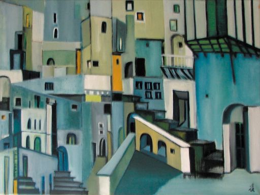 klkpl,06, Entree, Öl auf Leinwand, 60 x 80 cm, Jänner bis März 2004. Aus heutiger Sicht kann ich behaupten, dass eigentlich alle meine früheren Treppenbilder Vorarbeiten zu meiner karierten Phase waren. Zu Übungszwecken habe ich mich mit diesem Bild zu Anfang dieses Jahres wieder in die Zeit davor zurückversetzt.