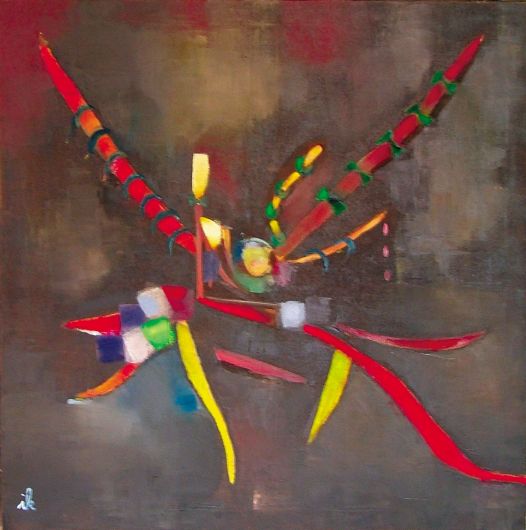 klkpl,07, Der braune Skorpion, Öl auf Leinwand, 80 x 80 cm, Oktober 2002. Mein malerischer Einstieg in die Thematik der Tierwelt liegt elf Jahre zurück. Da bekam ich den Auftrag, die „gelbe Kuh“ von Franz Marc im halben Originalformat zu kopieren. Als freie Fortführung habe ich meinen braunen Skorpion entwickelt. Wobei die besondere Schwierigkeit darin bestand, dass ich schon oft eine wirkliche Kuh, bisher aber noch nie einen echten Skorpion gesehen habe.