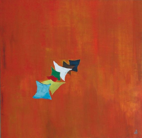 Glückspölsterchen, Öl auf Leinwand, 100 x 100 cm. November 2002. Das Bild ist die vereinfachte Fortsetzung meines gleichnamigen früheren Bildes, welches ein Versuch war, eine besonders angenehme Phase als Pölsterchen zu speichern, und ist gleichzeitig eine Vorstudie zu „kariert gepolstert“.