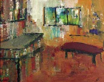 25, Nostalgie, Öl auf Holz, 40 x 50 cm, April 2001. Hier geht es um das halbverdeckte Frauenportrait im Hintergrund des Bildes. Es ist ganz allgemein „das Portrait der Vorgängerin“, die „über dem Raum“ eines Mannes schwebt, wenn er eine neue Verbindung eingeht, bevor er eine alte abgeschlossen hat. Beim ersten Streit wird die Frau auf dem Bild schöner, besser, erhabener, großzügiger, erotischer und gleichzeitig mütterlicher als die in der jetzigen Wirklichkeit Anwesende. Wie konnte er sie gehen lassen?