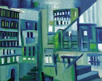 fv-30, Installazione città, olio su tela, 40 x 50 cm, agosto 2001: come percepiamo una città dipende molto probabilmente anche da quello che cerchiamo. A Bologna per esempio, io e Susanna siamo andate alla ricerca di un bancomat di quell’insegna più o meno di questo blu e più o meno di questo verde.