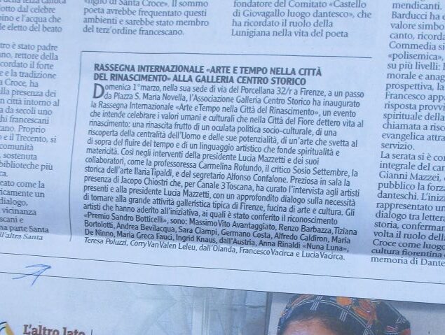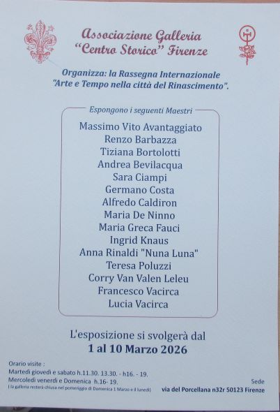 L’Umano e il Divino nell’arte contemporanea, anlässlich des 570. Geburtstages von Filippo Bruneleschi, Accademia Int. Gent. Il Marcocco di Firenze, 13. bis 20. Februar 2016, Galleria presso il centro storico, Firenze, Via del Porcellana, 32; Samstag, 12.2.2016, 12.00 Uhr; con Premio in ricordo di Filippo Bruneleschi;
